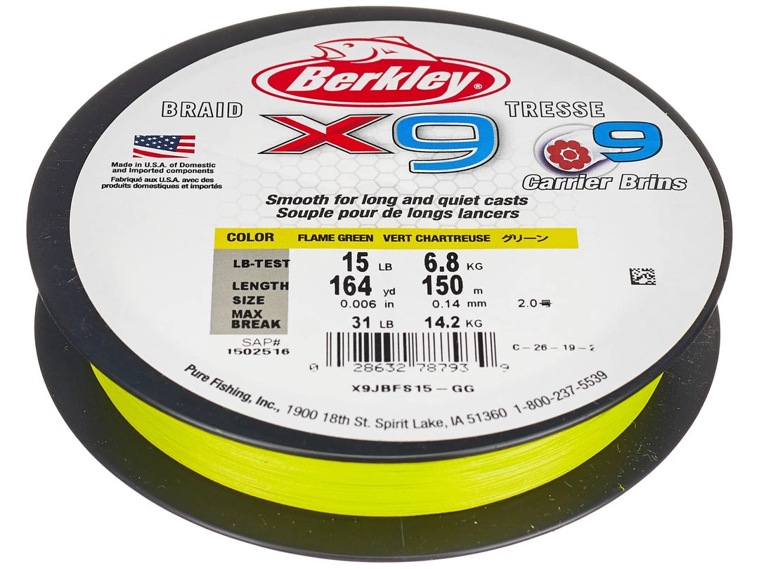 Designed for longer casting distances and maximum strength, the Berkley X9 Braided Line utilizes Berkley’s latest technologies to provide the smoothest and strongest braided line on the market at an affordable price. Featuring a 9-carrier construction with a PE core, the Berkley X9 Braided line is extremely round and smoothly flows through guides for increased casting distance. Its high strand construction also enhances wear resistance for fishing over rugged structure and provides higher knot strength. Finished in a stealthy lo-vis green color that is ideal for fishing in vegetation, Or the flame green for those individuals that like to see their line for shakey head, drop shot and Ned rig applications. Berkley X9 Braided Line offers advanced performance that won’t put a damper on your bank account.