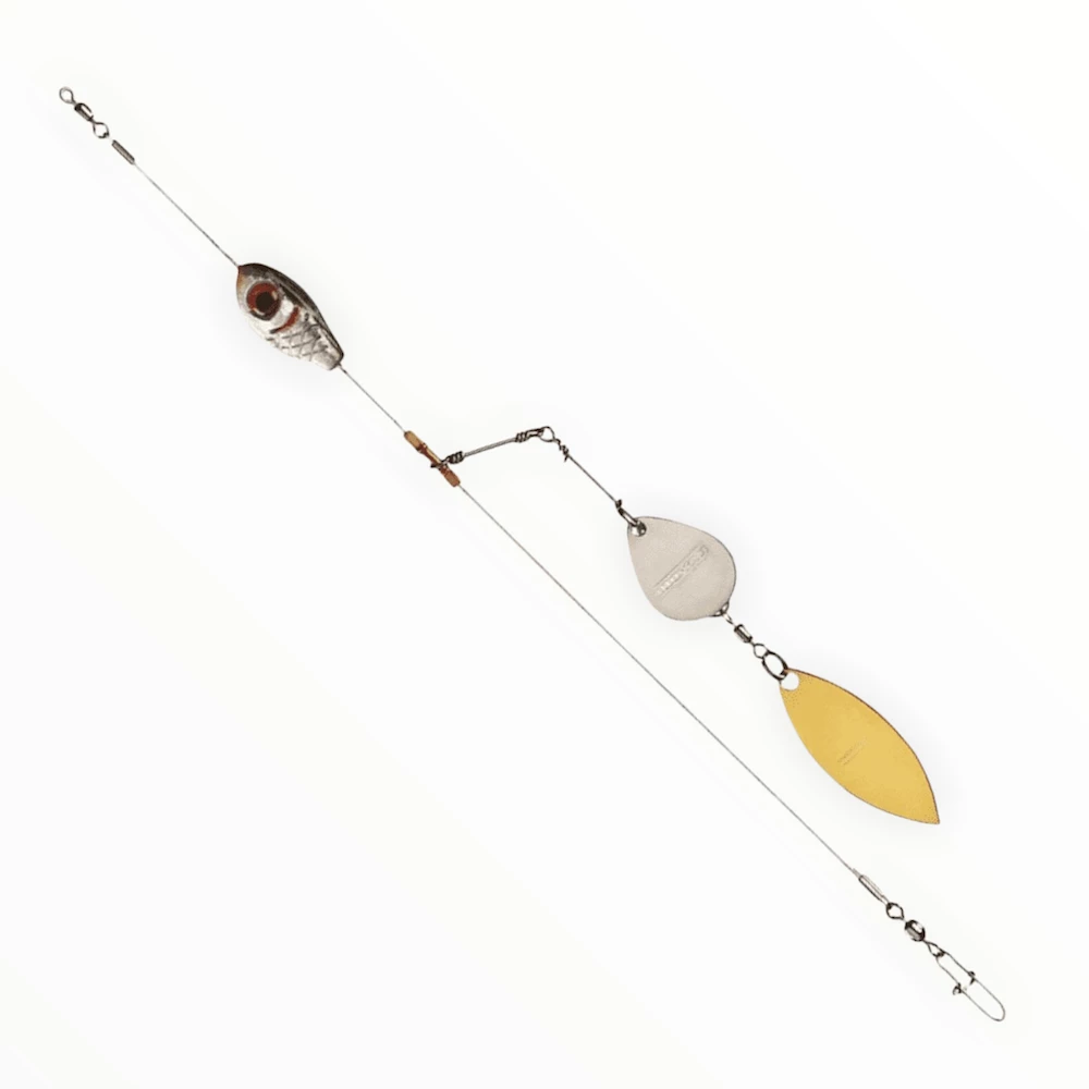 The BOOYAH Boo Spin Rig consists of a weighted baitfish-shaped head and a pair of spinnerbait blades attached to a super-strong, flexible wire, the Boo Spin Rig lets anglers attach any lure in their tackle box to create a look and action never-before-achieved. This BOOYAH rig lets you attach a shallow-running crankbait to a weightless, Texas-rigged swimbait behind the spinning blades and fish it at any depth.