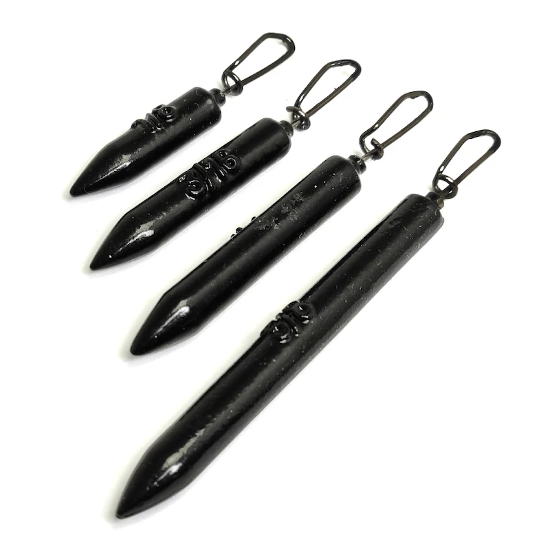 attached directly to the Gika Rig eye via a solid ring. The weight features a snap that allows anglers to quickly change the size of the weight when the situation calls for it and is painted black for stealthy presentations. The weight size is permanently stamped into the side of each weight making it easy to identify when it’s time to make a change. Changing weights controls the depth and drop speed of the bait adding to the rig’s versatility.