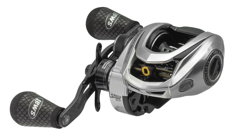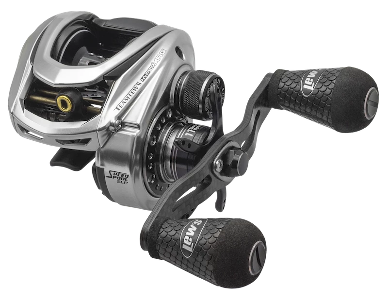 Is built on the exclusive SLP Super Low Profile platform, which is Lew’s lowest profile design, the HyperMag is also one of Lew’s lightest baitcast reels, weighing only 5.4 ounces. The HyperMag baitcaster has a one-piece magnesium frame, C45 carbon sideplates and premium 11-bearing system with double-shielded stainless bearings and Zero-Reverse anti-reverse clutch bearing. Gears are hard-anodized aluminum alloy. The reel’s compact size is made possible by the reel’s innovative 32mm aircraft-grade Duralumin U-shape spool that starts and accelerates faster than large spools so it simply handles light line and lures better than traditional-size baitcasters, without compromising power and performance. It can handle all bass fishing techniques!