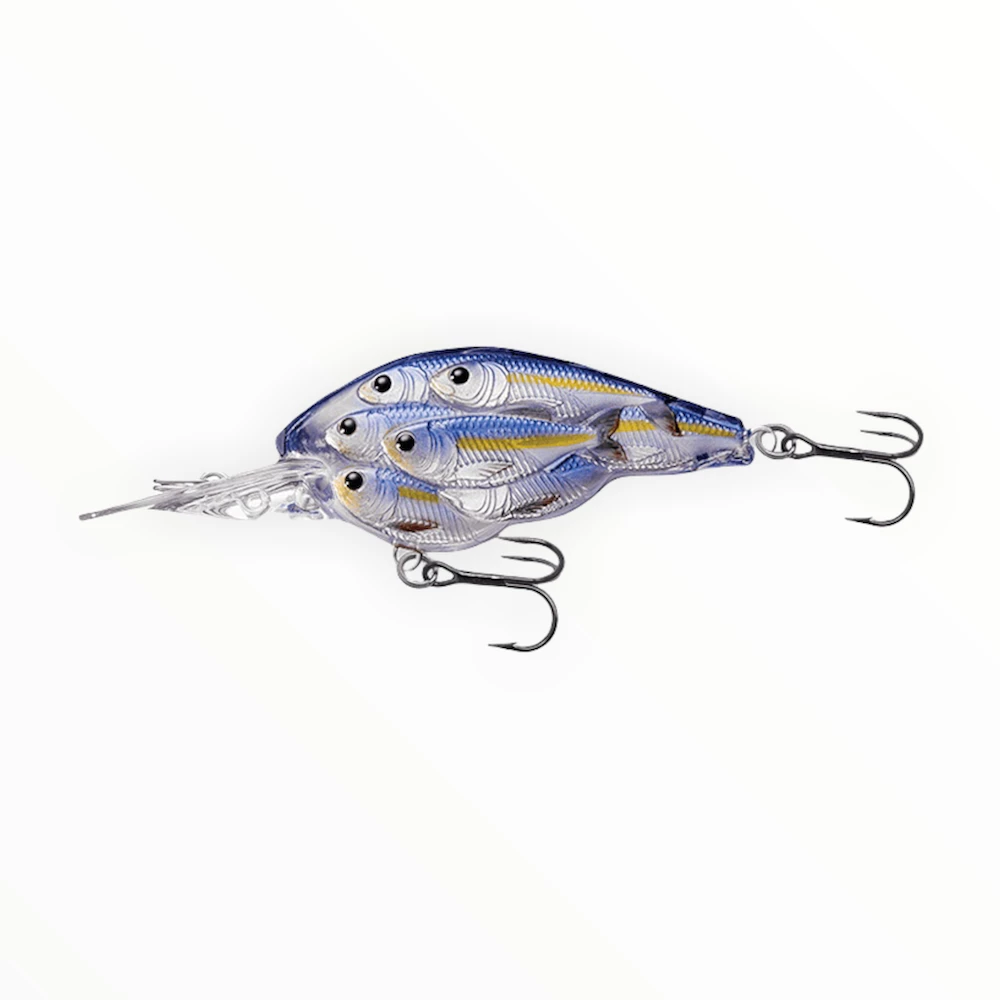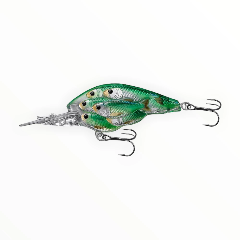 The LIVETARGET Yearling Crankbait collection incorporates the innovative Yearling BaitBall design into a small crankbait profile covering mid-range water depths. Available in three sizes. The hybrid bill design delivers a tantalizing body flash and deflects well off of cover to trigger key reaction bites. Each lure incorporates a different number of 3-D hatchlings, all of which are the same size, strategically grouped to create a different mass.