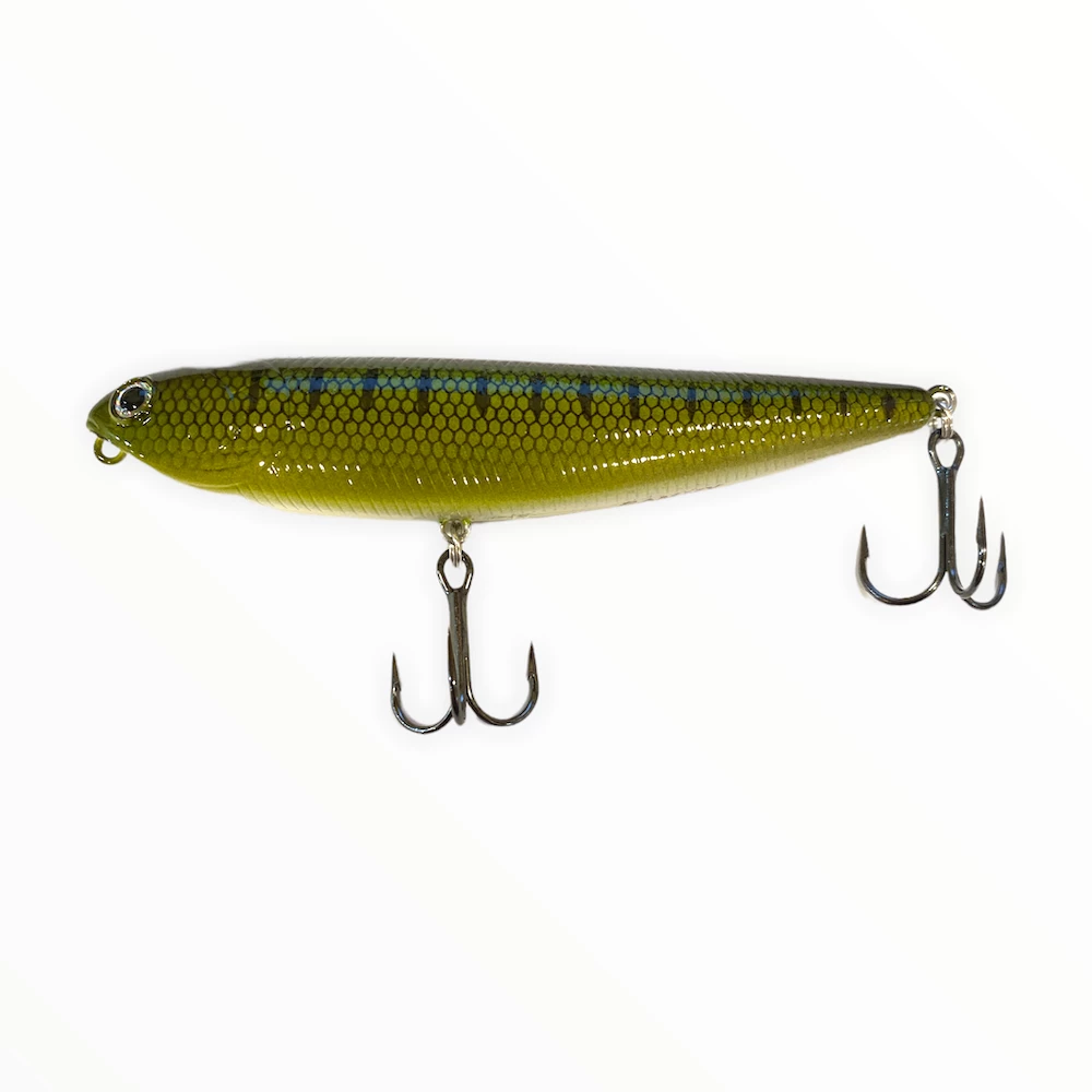 The tapered body and weighted tail makes the head of this bait sit high in water, putting it in a prone position which provides instantaneous turning and splashing with the slightest rod movement. The internal glass rattles call fish from great distances and depths. Professionals know that when it comes to drawing in fish on top, there is no better action than “walking the dog” and with the Sammy’s lifelike finishes and unsurpassed action, fish don’t stand a chance.