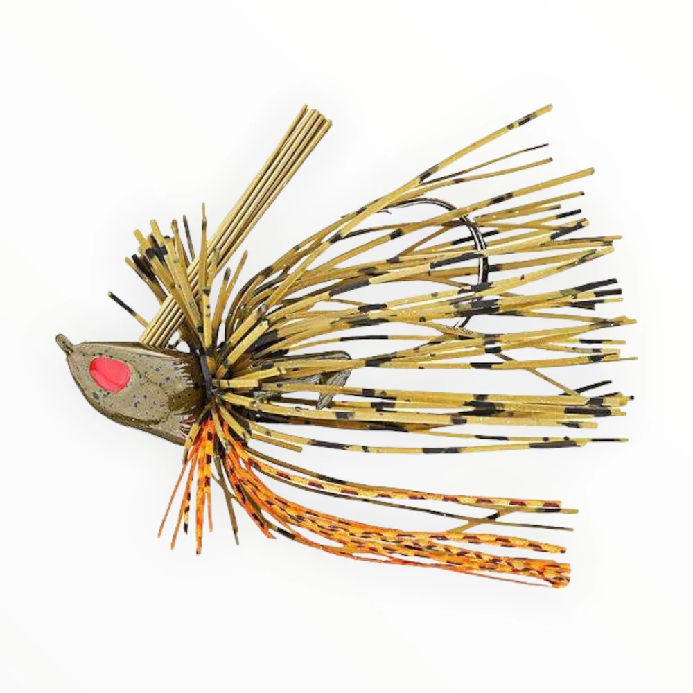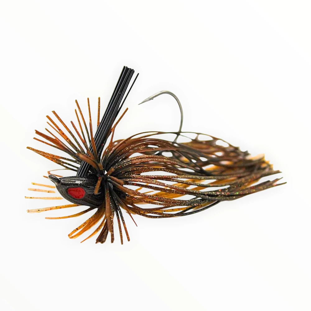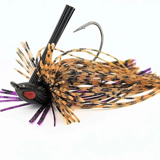 The Omega Pitching Jig was created at the Lake of the Ozarks in Missouri. It features a triangular-shaped head designed to help it come through brush and rocks, as well as a flat face that makes it easy to skip under docks, cables and other cover. Its flat face design also allows it to stand up when at rest at a 45-degree angle and imitate the defensive position of a crawdad. A 60-degree flat hook eye helps produce higher percentage hook ups, and its beefier hook won’t bend out when you’re wrenching fish out of cover. An oversized skirt collar and trailer keeper also firmly keep the skirt and trailer in place, and a rattle band allows you to add two rattles for added fish attraction. Available in a range of colors, the Omega Pitching Jig features a small profile, and the wherewithal to help you land more fish.