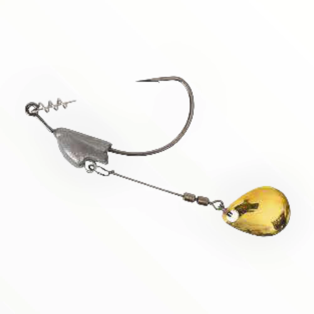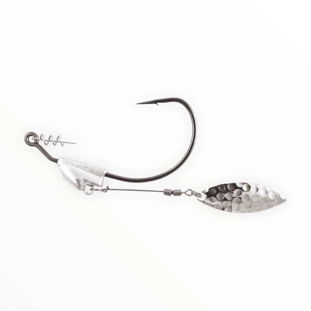 FLASHY SWIMMER with Owner’s TwistLOCK™ Centering-Pin Spring is a unique setup for rigging soft swimbaits, flukes, and other swimming plastics. The spinner blade is attached to a non-moveable weight that keeps a rigged soft plastic perfectly for use as an ideal “search” bait. In lieu of spinnerbaits or crankbaits, the flashy swimmer can be used as an alternative to cover a lot of water in a short time. A multitude of presentations can be achieved by switching baits and the speed of retrieval. The added weight helps sink or “swim” the rigged bait down into the strike zone, while the blade adds a fish-attracting flash. The wire pivots where attached to the weight, but the design of the molded lead keeps the wire and blade riding horizontally during a steady retrieve. Attached to the wire is a #3 hammered nickel-finished willow leaf blade, rigged with a dual mini swivel. Other features include a TwistLOCK™ “Centering-Pin Spring” (CPS-patent pending) attached to the hook eye, an “open” gap for more positive hook sets, an XX-strong forged shank, Super Needle Point, and black chrome finish.