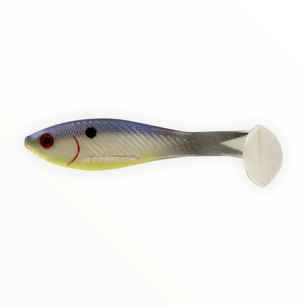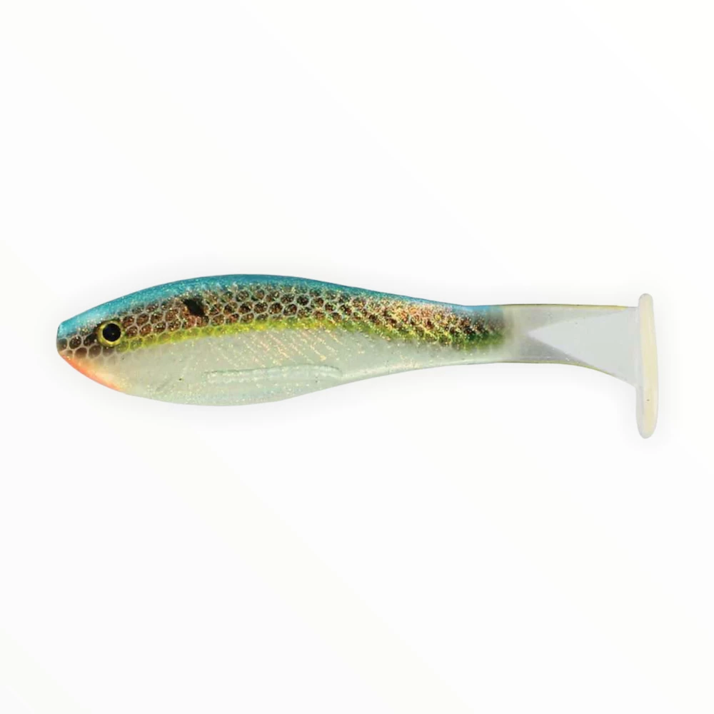 The BB Kicker has an extra large boot tail for tremendous kicking action. A slot in the belly allows it to be rigged on various types of swimbait hooks, or you can use a coffee straw and turn it into a line-thru. Each bait is hand painted and features an “invisible tail” where the tail is clear plastic and a forked shad tail is painted on for the most realistic appearance.