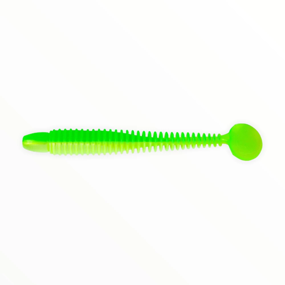 A Swimbait style worm. The design of the outer diameter of the rings defines the lure’s appearance while the substantially smaller diameter of the back half of core allows the flexibility to attain incredible swimming action yet appear to have more bulk. This thinner core allows the freedom to generate an exaggerated swing action wildly from side to side.