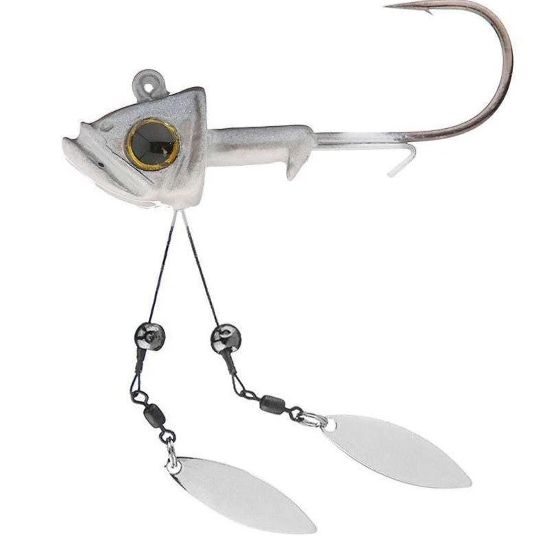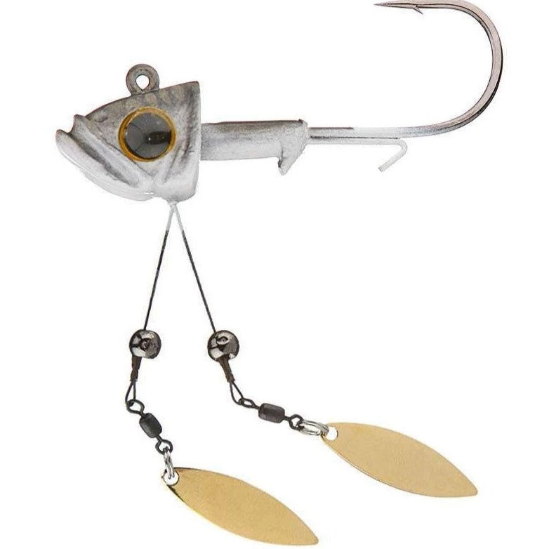 The double blades are engineered to be kept away from the head for optimum flash and prevent the blades from fouling with each other or the soft plastic trailer. The longer nickel titanium wires provide extra protections against getting hung up on bottom structure yet are soft enough to collapse on the strike assuring a good hook set.