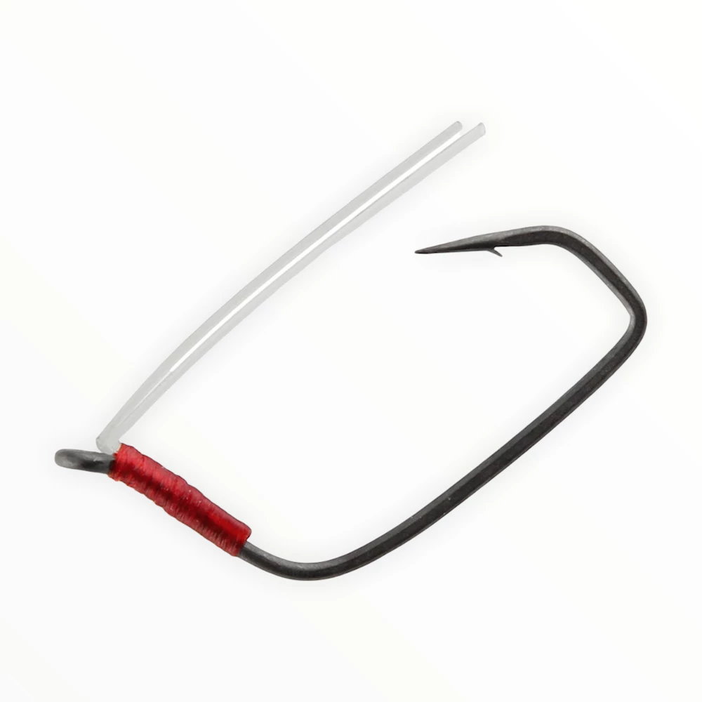 This hook’s superior wacky worm and/or finesse fishing performance follows a simple process: hooking power travels directly to hook point with slight flexibility that allows the hook to penetrate deeper as the bass fights harder (reaches the hook’s first bend angle), followed by the final bend penetrating deeper and preventing bass from coming off. The Spin Muscle Guard achieves what other wacky worm and/or finesse fishing hooks cannot – namely providing bass anglers with stable penetrating hooksets that actually dig deeper as bass thrash, fight, and attempt to throw the fishing hook.
