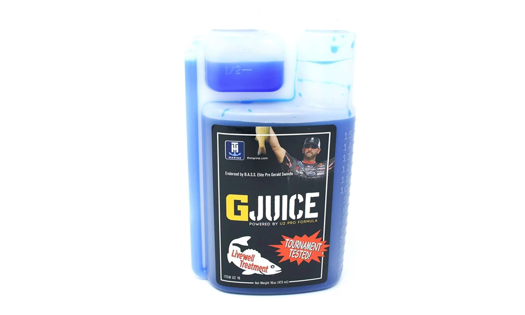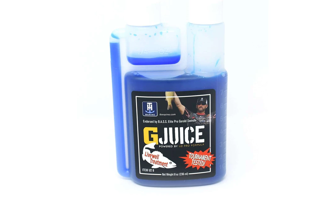 The T-H Marine G-Juice Freshwater Live Well Treatment keeps fish healthy and anglers from incurring costly penalties at weigh-ins. By adding essential electrolytes to live well water and removing harmful nitrates, ammonia, chlorine and heavy metals, the T-H Marine G-Juice Freshwater Live Well Treatment ensures your fish make it to the dock at their optimum weight. The G-Juice formula was developed from over 15 years of research and is proven to replace skin slime and stop fish from bleeding. A fish under duress can experience weight loss or regurgitate what it has recently eaten, causing you to lose precious ounces. Protect yourself against penalties and fish against injury with the T-H Marine G-Juice Freshwater Live Well Treatment. T-H Marine G-Juice Freshwater Live Well Treatment is the trusted choice of BASS Elite Series pro, Gerald Swindle.