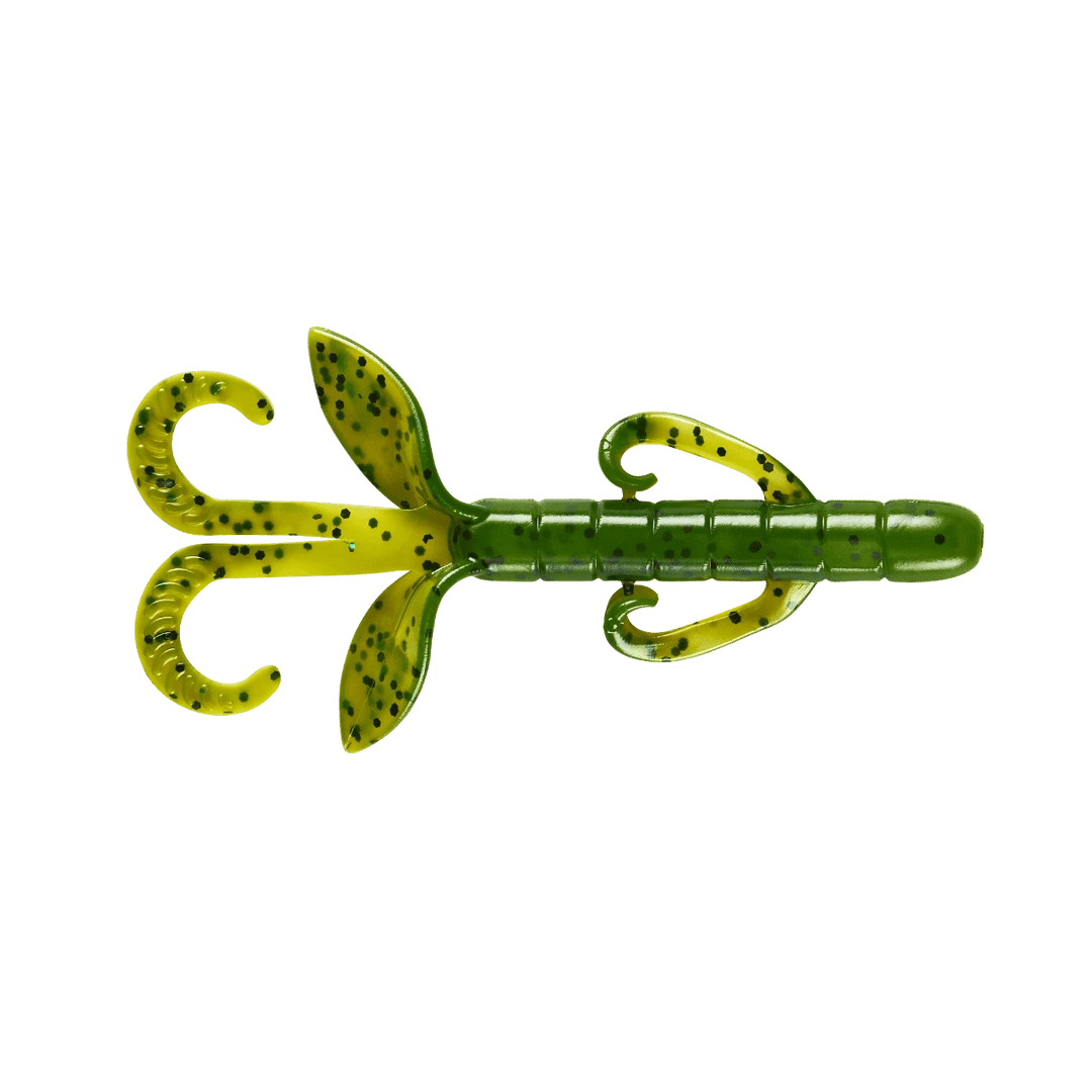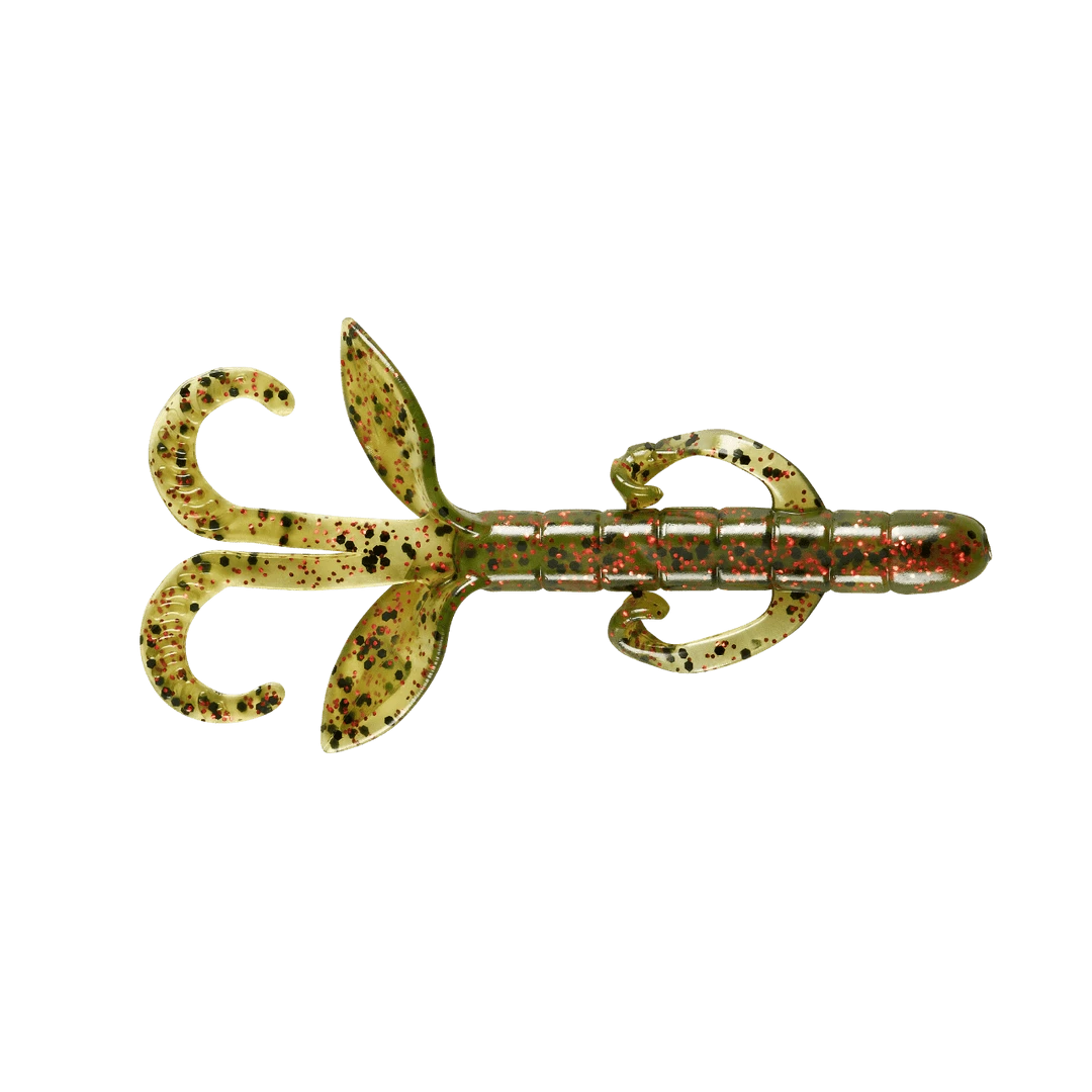 Designed by one of the top professional angler in the world, Jason Christie, this creature bait has all of the features anglers want in a bait for flipping, pitching and casting on a Carolina or Texas rig. Multiple appendages add tremendous water displacement. The top swimming arms are attached at top and bottom, but can easily be pulled loose at the bottom for more swimming action. The big flappers push tremendous water when combined with the double curl tails.